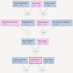 Wie in der seitlichen Grafik zu sehen ist, hieß die Tochter von Focko Fransen: Susanna Focken oder der Sohn von Hindrik Berents: Berent Hindriks.