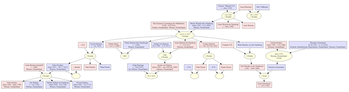 Auf dieser Grafik sind die verwandtschaftlichen Beziehungen von Menne Sybens ter Haseborg zu sehen. Grafik erstellt mit Gramps.