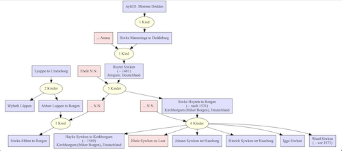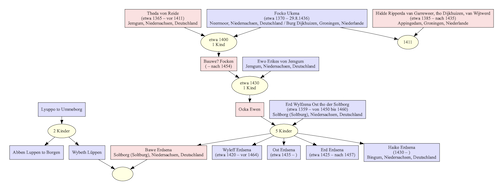 Verwandtschaft des Focko Ukena mit Lyuppo to Ummeburch, Grafik erstellt mit Gramps